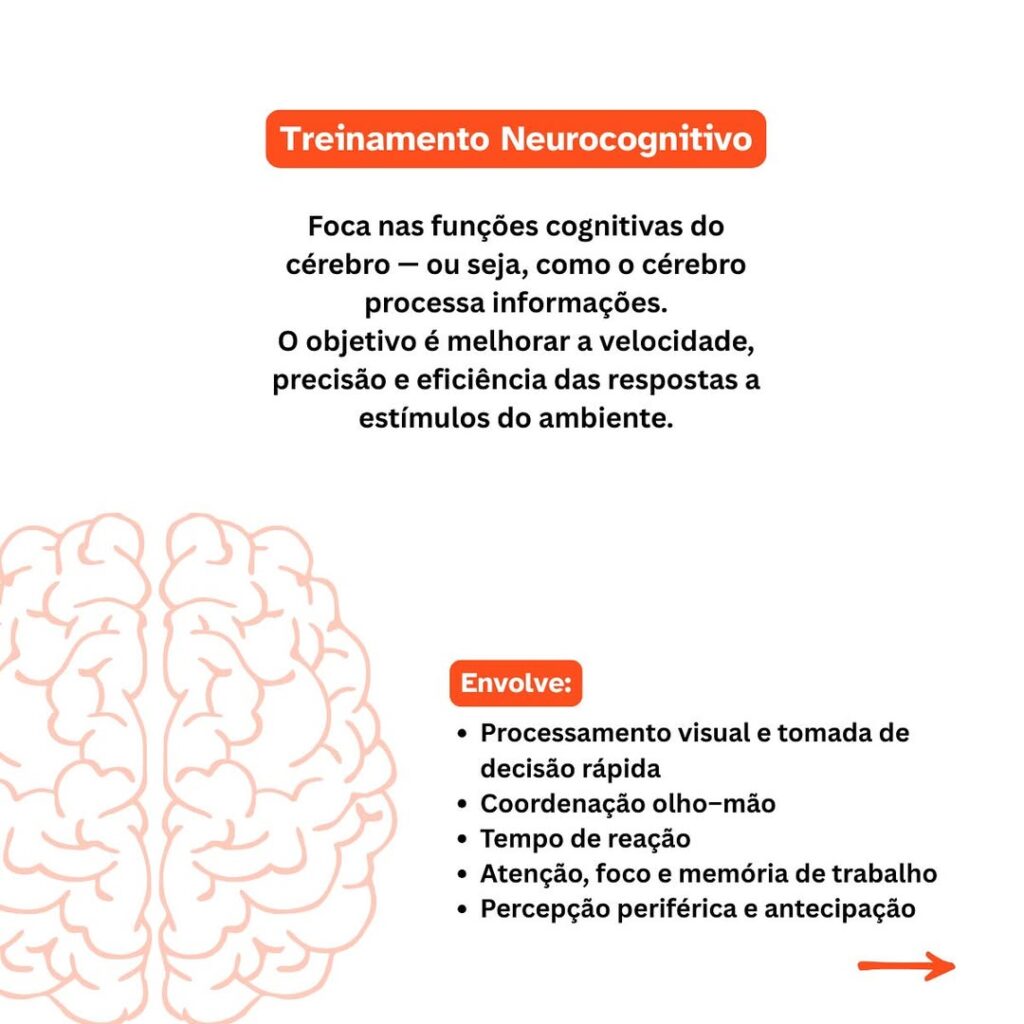Enquanto o treinamento mental fortalece o controle emocional e o mindset, o treinamento neurocognitivo atua na raiz do desempenho, otimizando como o cérebro capta, processa e responde a estímulos em milissegundos.